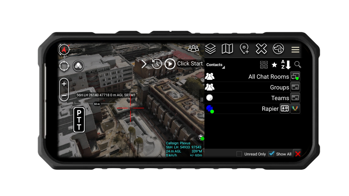 Integrate into ATAK on self hosted Rapier Systems EDGE Ecosystem and communicate over cellular, satellite or mesh networks (additional nodes required).